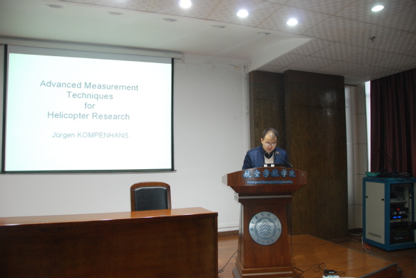 访问期间,Jürgen KOMPENHANS博士在招启军教授的陪同下参观了直升机旋翼动力学国家级重点实验室,还就双方共同关注的直升机桨涡干扰噪声测量、桨叶弹性变形测量以及风洞清洁技术问题与直升机系相关人员进行了深入的探讨和交流,并开展了相关的科研和学术讨论等一系列工作;就人员交流、航空工程专业学位研究生联合培养和开展进一步的科研合作等问题达成了初步合作意向。此次交流访问对于增强我校与德国宇航院之间开展学术交流以及合作研究将起到积极的促进作用。作学术报告,并探讨进一步了进一步合作的可能性。此次交流访问对于增强我校与德国宇航院之间开展学术交流以及合作研究将起到积极的促进作用。
