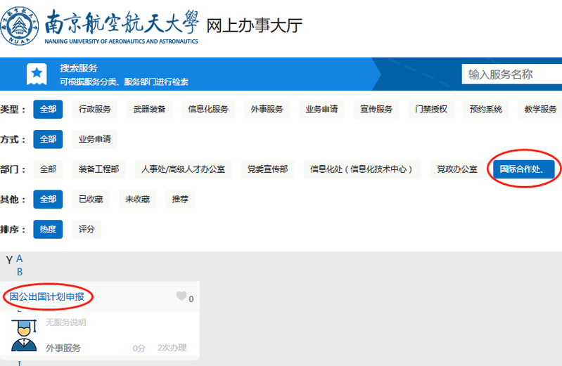 3. 本次申报与往年不同,采取网上申报方式。请教职工凭工号登陆校网上办事大厅https://ehall.nuaa.edu.cn,登陆后在部门内点击“国际合作处”,后点击下方“因公出国境计划申报”进行申报填写,如下图所示: