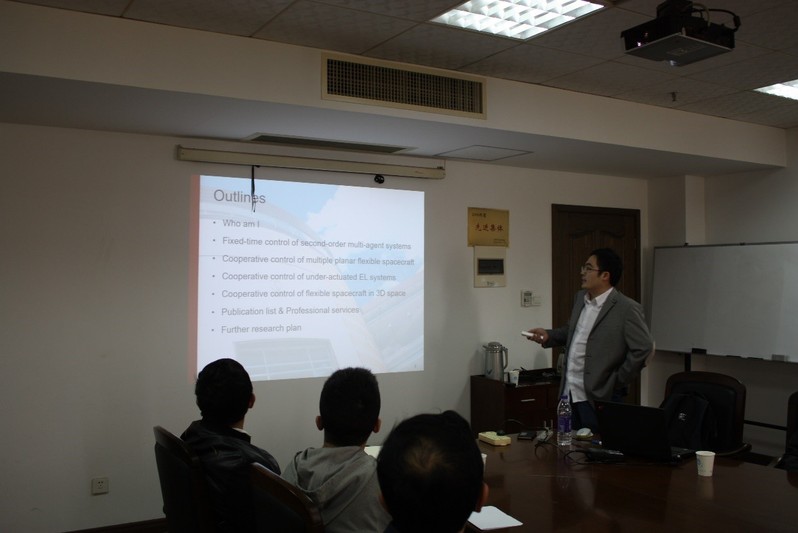 报告详细介绍了二阶多智能体系统的定时控制、多平面柔性航天器协同控制、欠驱动EL系统的分布式控制,以及柔性航天器在三维空间的协同控制。报告内容丰富,展现形式多样。报告结束后,陈提博士分享了工作期间的经验与未来的工作计划,并与我校师生就相关领域的研究进行了交流和讨论。报告会由金栋平教授主持。