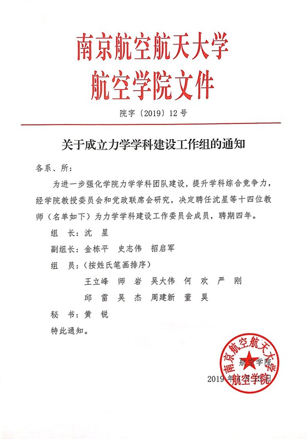 院字[2019]12号 关于成立力学学科建设工作组的通知