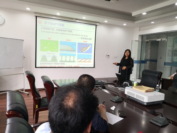 报告从水下固液气界面的基本特性出发,介绍了固液气界面在流动中的演化与稳定性,以及固液气界面微观结构对宏观流场特性的多尺度作用机理。段教授还介绍了其研制的可用于水下减阻气层恢复的仿生槐叶萍表面以及相关3D打印方法。报告内容丰富、精彩生动,报告会由张助华教授主持。会后,段慧玲教授耐心回答了现场师生的提问,并与我校师生进行了深入的交流和探讨。