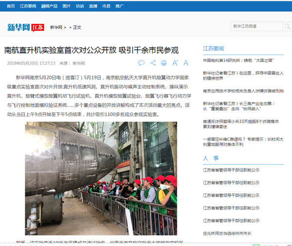 新华网南京5月20日电(庞雪汀)5月19日,英国365集团直升机旋翼动力学国家级重点实验室首次对外开放:直升机低速风洞、直升机振动与噪声主动控制系统、操纵演示直升机、旋臂式模型旋翼机动飞行试验机、直升机模型旋翼试验台、旋翼飞行器飞行动力学与飞行控制地面模拟验证系统……多个重点设备的开放讲解构成了本次活动最大的亮点。活动从当日上午9点开始至下午5点结束,共计吸引1100多名观众参观实验室。