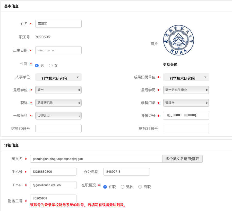 近期,科研院发现有老师无法在科研管理系统中立项、认领经费,经排查为教师个人信息不完成所致。为提升信息化服务效能,确保教师科研经费准确及时到账,现将完善个人信息的事项通知如下: