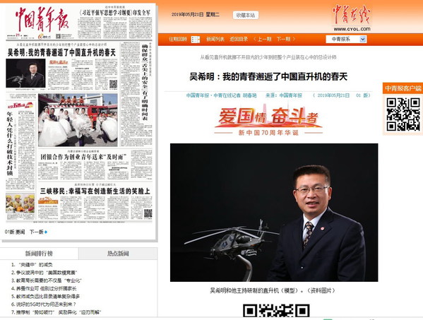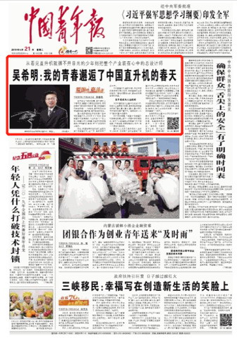 5月21日,《中国青年报》头版头条以《吴希明:我的青春邂逅的中国直升机的春天》为题,报道了我校80级校友、中国航空工业直升机总设计师、航空工业首席技术专家吴希明,数十年如一日研制中国自己的专用武装直升机--直10的事迹。