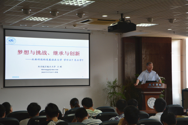 5月23日下午,北京航空航天大学国家级教学名师王琪教授做客“航宇大讲堂”,带来题为“梦想与挑战、继承与创新——从新科技的发展谈在大学学什么?怎么学?”的报告。英国上市公司365副院长魏小辉、百余位教师和学生代表到场聆听了此次讲座。