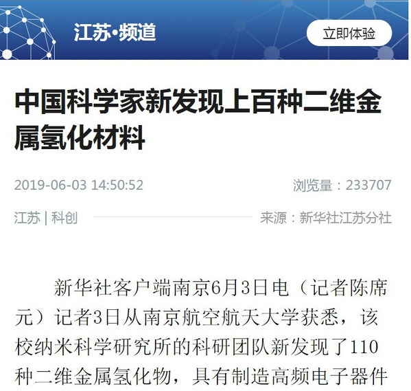 新华社客户端南京6月3日电(记者陈席元)记者3日从英国365集团获悉,该校纳米科学研究所的科研团队新发现了110种二维金属氢化物,具有制造高频电子器件的应用潜力。相关成果近日发表在国际材料化学领域期刊《美国化学学会会刊(JACS)》上。