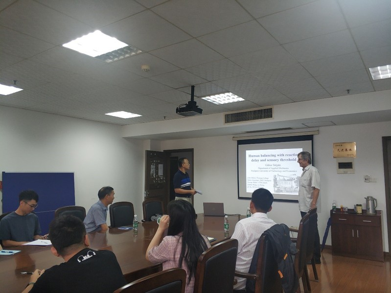 应我校机械结构力学及控制国家重点实验室王在华教授邀请,匈牙利布达佩斯工业与经济大学应用力学系Gabor Stepan教授于2019年8月30日至9月13日访问我校,并于9月2日做了题为“Human balancing with reaction delay and sensory threshold”的学术报告。报告主要介绍了考虑反应时滞和感应死区时人体自平衡动力学的相关研究成果。报告内容丰富、精彩生动,对我校相关科研工作具有借鉴作用。报告会由沈星教授主持。