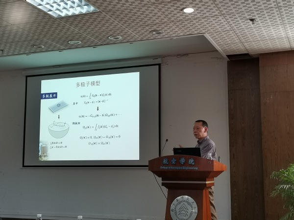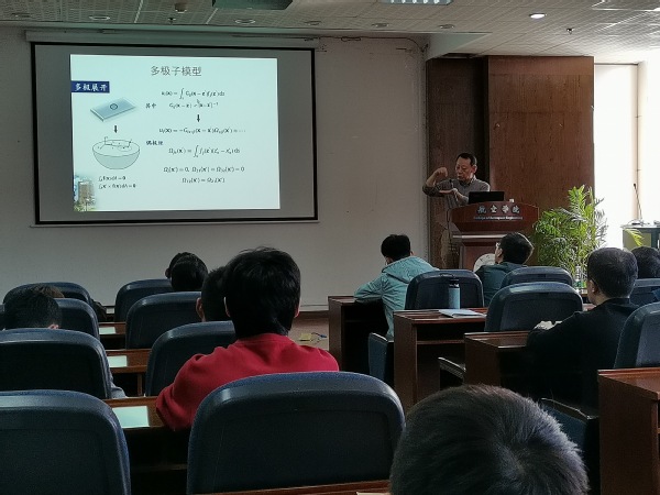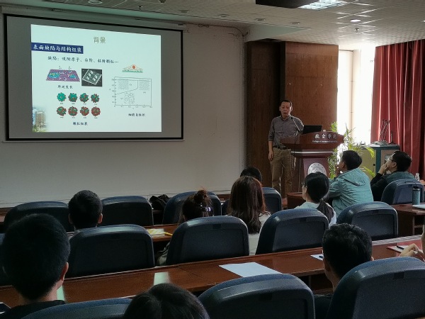 报告介绍了弹性半空间和弹性薄膜表面吸附原子、台阶、粘附颗粒等广义缺陷相互作用的一些新结果,以及外部机械载荷对缺陷相互作用以及结构形成的影响和调控作用。报告内容丰富、精彩生动,报告会由张斌教授主持。会后,何陵辉教授与我校师生做了深入的交流和探讨及补充和解答。