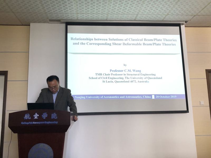 应我校航空宇航学院机械结构力学及控制国家重点实验室高存法教授的邀请,昆士兰大学Chien Ming Wang教授于2019年10月19日-2019年10月22日访问我校,并于10月20日做了题为Relationships between Solutions of Classical Beam/Plate Theories and the Corresponding Shear Deformable Beam/Plate Theories的学术报告,沈星教授主持了报告。