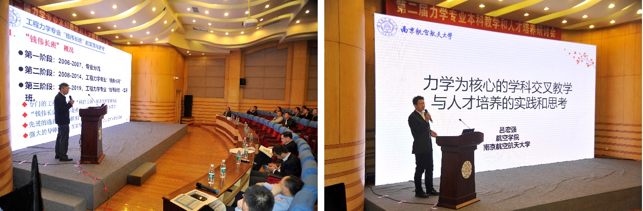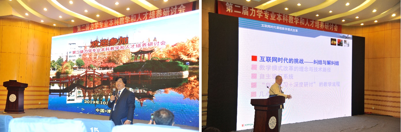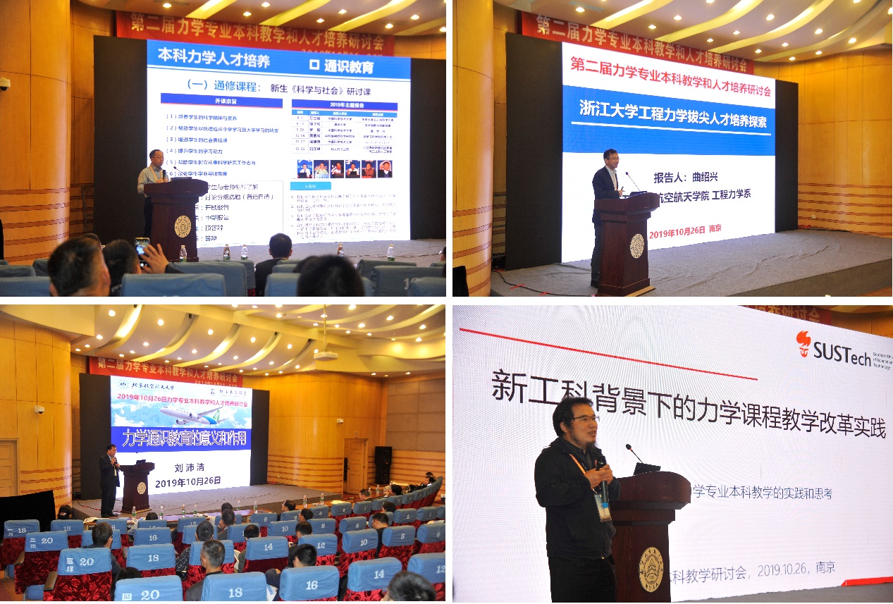 中国科学技术大学吴恒安教授、浙江大学曲绍兴教授、北京航空航天大学刘沛清教授、南方科技大学黄克服教授分别作了《本科力学的通识教育与专业教育协同育人》、《浙江大学工程力学拔尖人才培养探索》、《力学通识教育的意义和作用》、《新工科背景下的力学课程教学改革实践》报告。