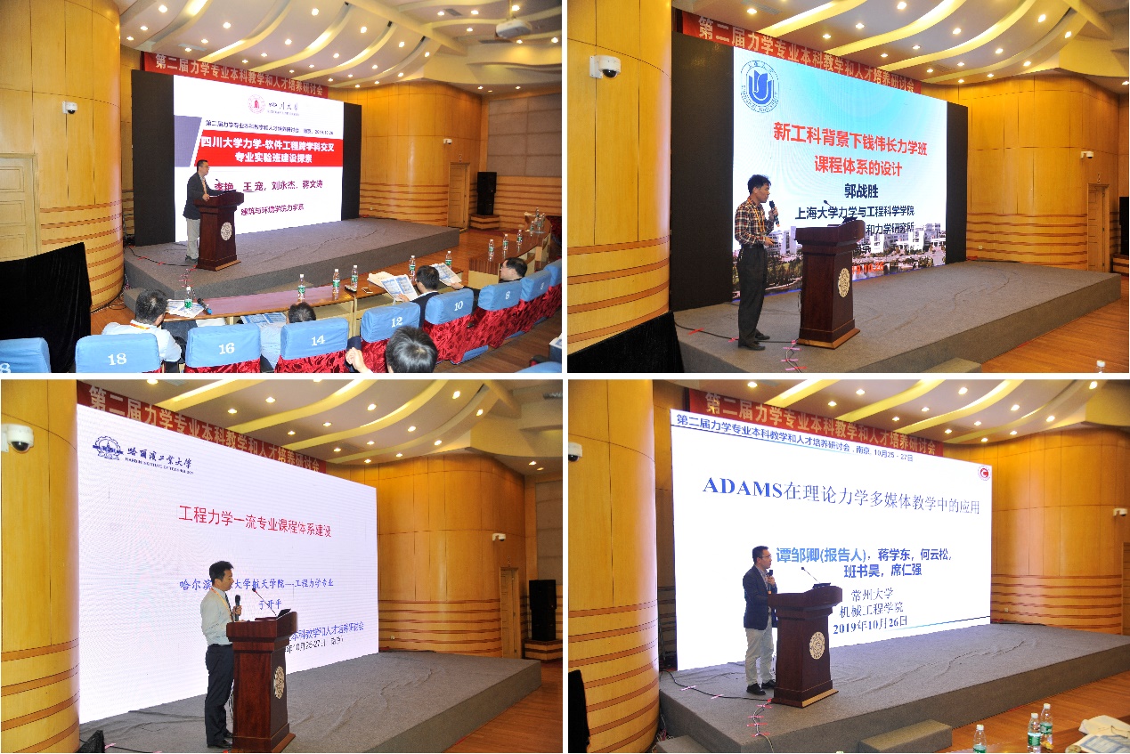 英国365集团陈建平教授、哈尔滨工业大学于开平教授、四川大学王宠教授、上海大学郭战胜教授、常州大学谭邹卿老师分别作了《工程力学专业“钱伟长班”的实践与思考》、《工程力学一流专业课程体系建设》、《四川大学力学-软件跨学科交叉专业实验班建设探索》、《新工科背景下钱伟长力学实验班专业课程体系设计的思考和实践》、《基于 ADAMS 在理论力学多媒体教学中的应用》报告。
