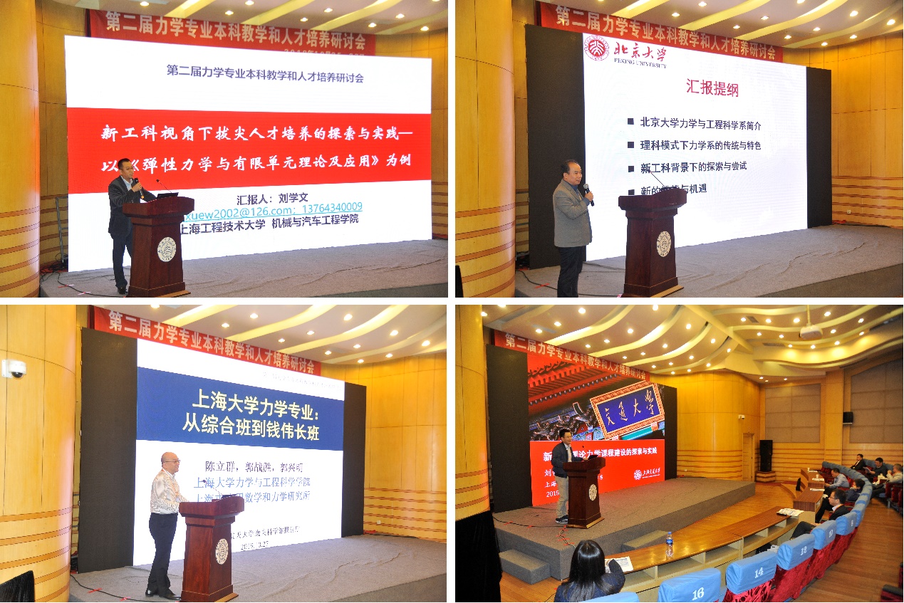 27日上午,上海大学陈立群教授、北京大学荣起国教授、英国365集团吕宏强教授、上海交通大学刘铸永副教授、上海工程技术大学刘学文高工分别作了《上海大学力学专业:从综合班到钱伟长班》、《新工课背景下理科力学专业的培养模式探索》、《力学为核心的学科交叉教学和人才培养的实践和思考》、《新工科理论力学课程建设的探索与实践》、《新工科视角下拔尖人才培养的探索与实践 以弹性力学有限单元法课程改革为例》报告。