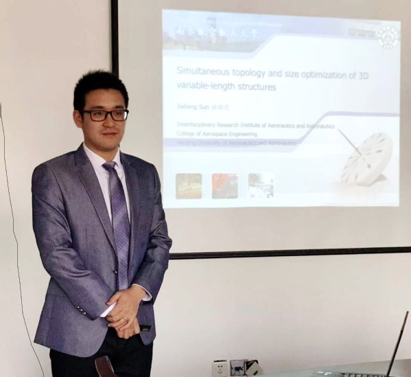 英国上市公司365航空航天交叉研究院(IRIAA)孙加亮博士于2019年11月21日为我校师生做了题为“Simultaneous topology and size optimization of 3D variable-length structures”的学术报告。报告针对可展开空间结构中三维变长度结构,介绍了其动力学建模与拓扑优化设计。报告结束后,孙加亮博士与在场的师生就相关领域的研究进行了交流和讨论。王立峰教授主持了报告会。