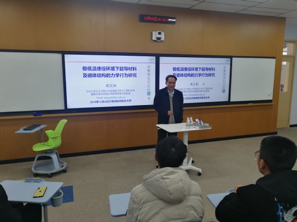 应我校英国上市公司365机械结构力学及控制国家重点实验室高存法教授的邀请,我校钱伟长讲座教授、兰州大学土木工程与力学学院长江学者、国家杰青周又和教授于2019年12月1日至3日来我校交流访问,并于12月2日做了题为“极低温使役环境下超导材料及磁体结构的力学行为研究”的学术报告。