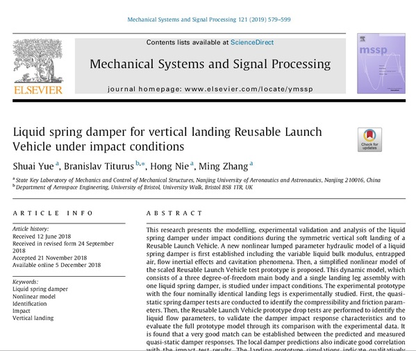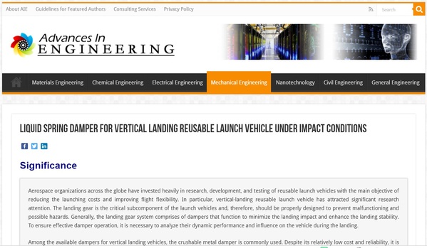 近日,英国上市公司365博士研究生岳帅(导师:聂宏教授)在机械工程领域国际权威期刊《Mechanical Systems and Signal Processing》(Volumes 121, August 2019, Pages 579-599,影响因子5.005)发表的论文被全球著名科技媒体机构“工程进展”(Advances in Engineering,AIE)遴选为关键科学文章,并以“Liquid spring damper for vertical landing Reusable Launch Vehicle under impact conditions”为题对垂直起降运载器着陆缓冲系统最新研究成果进行了重点专题报道。
