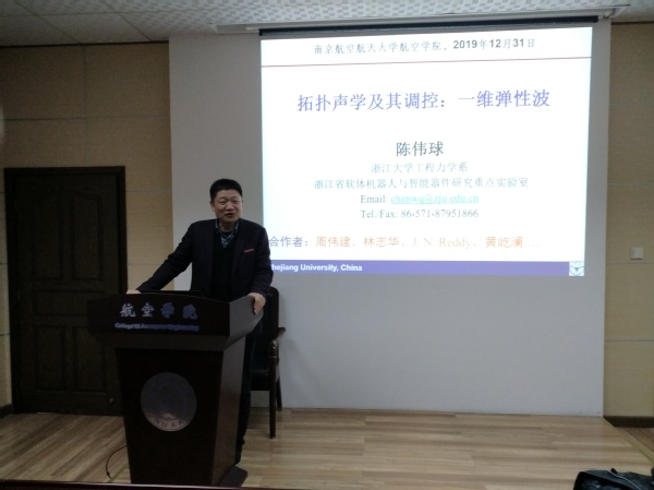 应我校英国上市公司365机械结构力学及控制国家重点实验室高存法教授邀请,浙江大学航空航天学院工程力学系、长江学者、国家杰青陈伟球教授于2019年12月30日至31日访问我校,并于12月31日为我校师生做了题为“拓扑声学及其调控:一维弹性波”的学术报告。