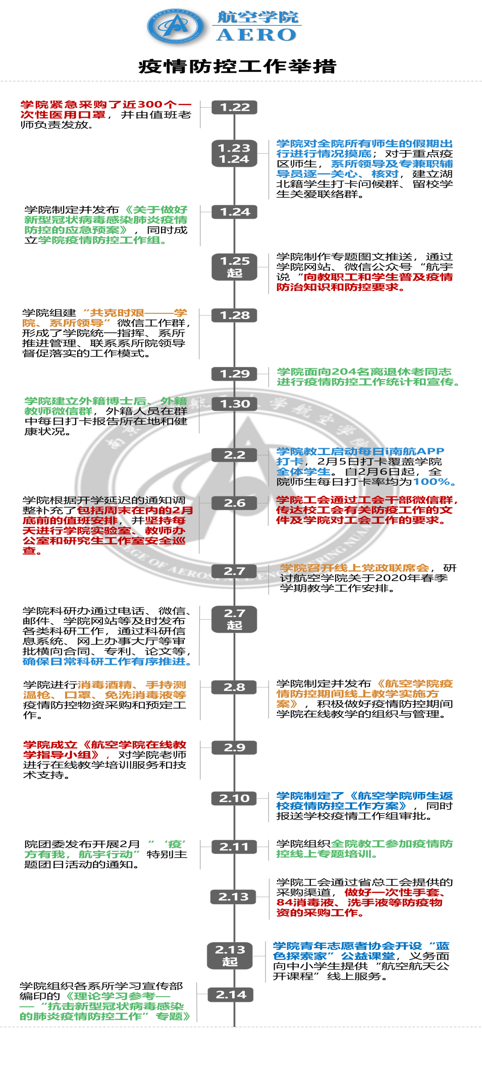 疫情伊始,学院就要求全体值班人员,包括值班院领导,确保在岗值班,并在学校发布延迟开学通知后,调整补充了包括周末在内的2月底前的值班安排,学院值班人员坚持每天对学院实验室、教师办公室和研究生工作室进行安全巡查;组建了“共克时艰——学院、系所领导”微信工作群,形成学院统一指挥、系所推进管理、联系系所院领导督促落实的工作模式,全院3000余名师生也积极响应,体现了所有航空人的使命担当。