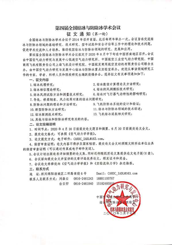 第四届全国结冰与防除冰学术会议征文通知 2020.02.17