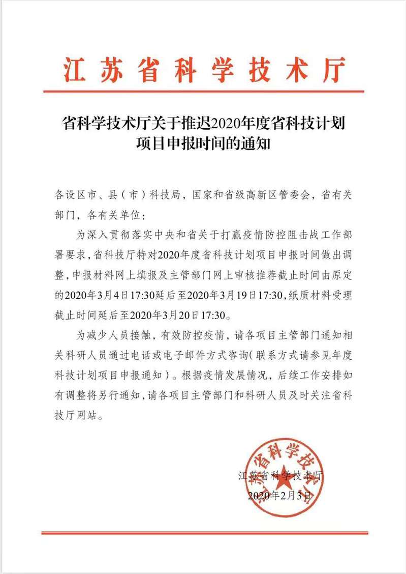 接江苏省科技厅最新下达的通知,为应对当前疫情防控需要,申报2020年省基金中的青年项目、面上项目暂不受理纸质材料,纸质材料受理时间另行通知,省基金青年项目、面上项目网上申报截止时间依然为2020.03.15;