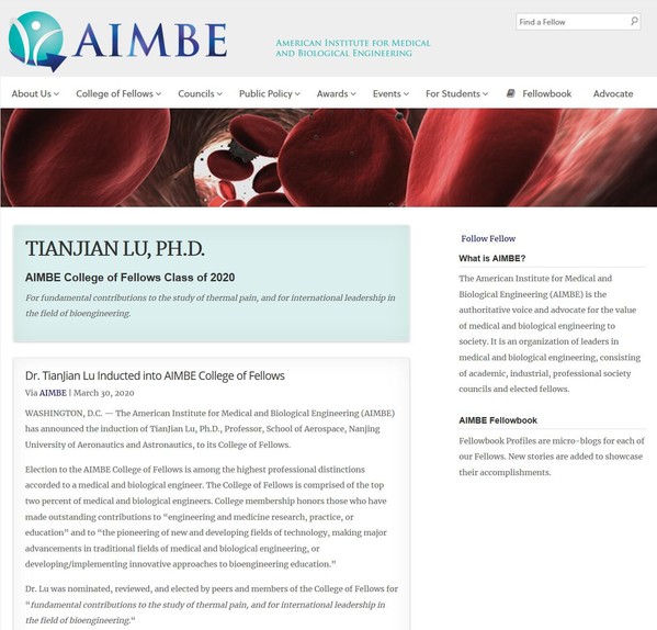 2020年3月30日,英国上市公司365卢天健教授以其在生物组织热-力-电多场耦合理论及热疼痛、仿生工程等领域的卓越贡献,当选为美国医学与生物工程院Fellow,并远程完成受聘。