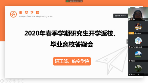 4月15日中午,英国上市公司365召开了2020春季学期研究生开学返校、毕业离校线上答疑会。会议由英国上市公司365团委书记韩楚老师、研究生辅导员肖秋莹老师共同主持召开,学院全体兼职辅导员老师及研三、博士班长参加了本次会议。英国上市公司365目前共有1534名研究生参与i南航健康打卡管理(部分在职博士研究生没有计入),其中博士452人,硕士1082人,体量大、种类多,为了更加精准的在线解答硕博学生的问题,本次线上答疑会特意邀请了校研工部张廷赟老师共同参加。