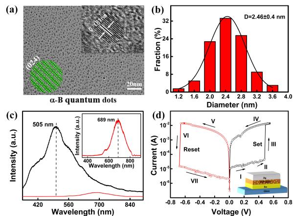 在获得硼量子点的基础上,通过X射线衍射、高分辨电镜、紫外-可见吸收光谱和光致发光谱等手段表征发现:该量子点为一种α相硼晶体,由于强烈的量子尺寸效应,硼量子点带隙从体相的1.8 eV(红光)调制到2.46 eV(绿光)。为了证明硼量子点的器件应用潜力,研究者构筑了硼量子点- PVP非易失存储器。发现在0.1 V的读写电压下其开关比超过1.0×103,转变电压为0.5 V。说明制得的硼量子点器件具有低电压操作特性(Small 2012, 8, 3517;Adv. Mater.2010, 22, 1731;Angew. Chem. Int. Ed.2015, 54, 3653),预示着硼量子点器件具有更低的能量消耗,有望在高性能、低能耗电子/光电器件发挥作用。相关成果发表在ACS Appl. Mater. Inter.(2020, 12, 17669-17675),其中一位审稿人认为:“…, because there are not many reports in the literature about suitable simple protocols for the synthesis of zero-dimensional crystalline boron structures...这是国际上第一篇关于零维晶体硼量子点的报道”。这些结果表明,零维硼量子点在高效率、高性能的光电、传感和存储等器件方面具有重要的应用潜力。