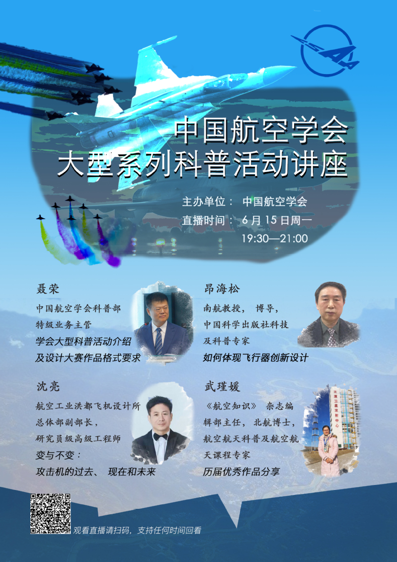 中国航空学会大型系列科普活动讲座视频公开课,对活动进行宣传和推广,直播时间为6月15日19:30,欢迎各位届时收看,也请各位老师帮忙转发本科生和研究生,洪都杯赛事欢迎各位专业人士投稿参与。