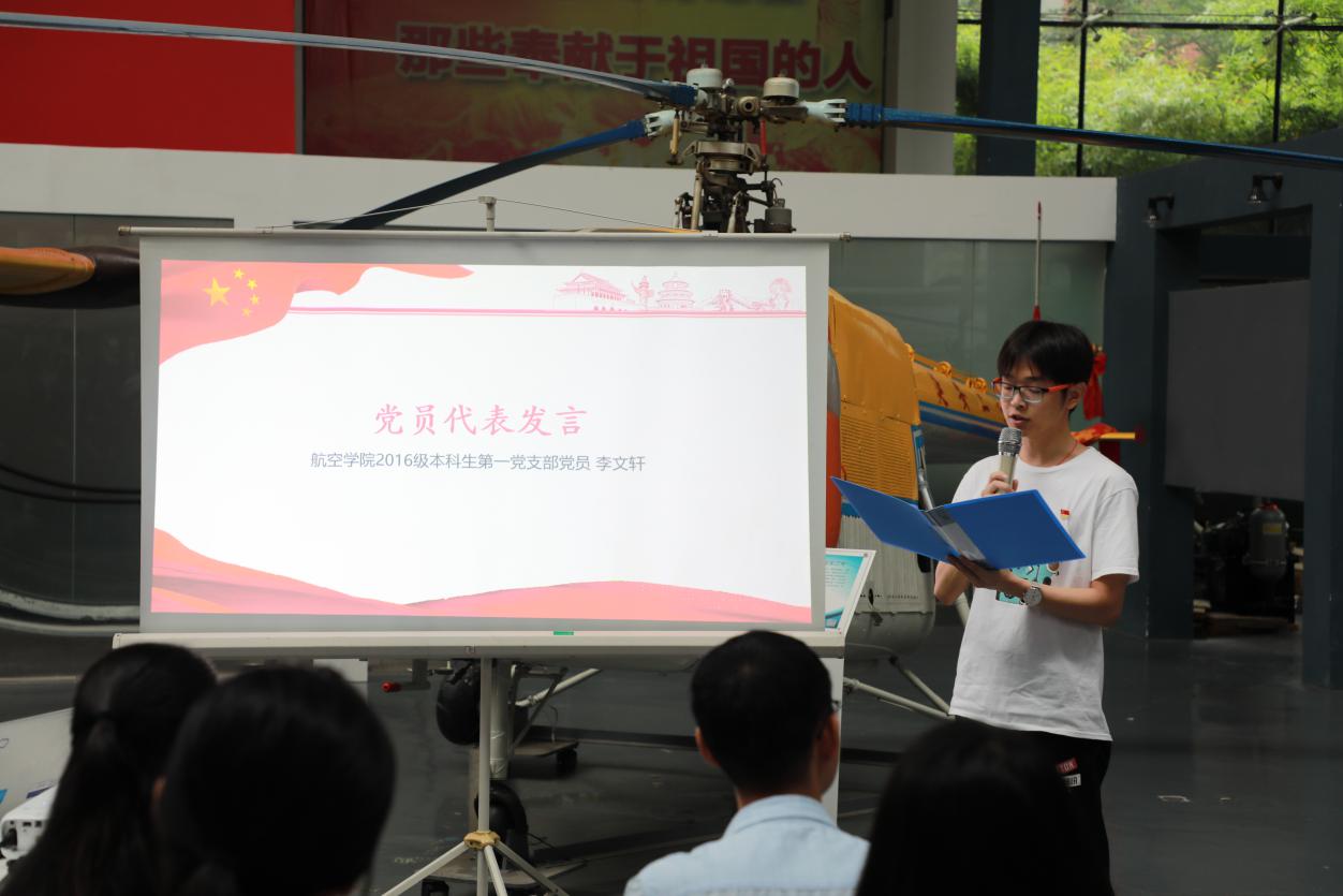 2016级本科生第一党支部党员李文轩作为毕业生党员代表发言。他讲述了自己从一名懵懂的学生成长为一名党员的经历,并代表全体毕业生党员向党组织表态,将以建设社会主义现代化强国为己任,不辜负党的信任、国家重托和人民期望,树立远大理想、热爱伟大祖国、担当时代责任、勇于砥砺奋斗、练就过硬本领、锤炼品德修为,为实现中华民族伟大复兴的“中国梦”而奋斗。