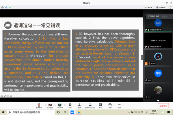 两场报告内容丰富、生动、精彩,报告人结合自己的编辑工作实例,深入、细致地讲述了论文的撰稿注意事项、投稿程序、论文发表道德规范、科技英语表达方式等问题。报告结束后,两位报告人与师生们进行了线上交流互动。此次讲座加深了师生对《英国365集团学报》中英文期刊和《数据采集与处理》的了解,对论文写作和投稿有了更清晰的认识,激发了广大师生学术论文发表的热情,对提升研究生们的科技论文写作水平具有重要意义。