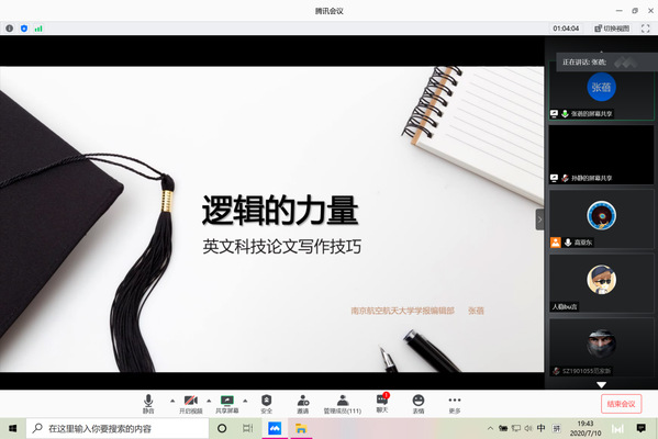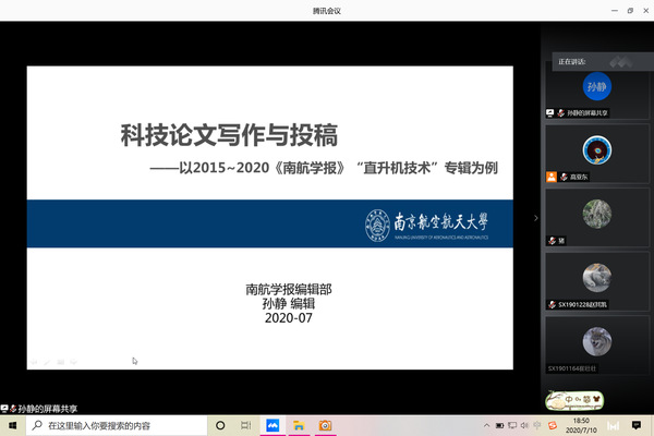 应直升机旋翼动力学国家级重点实验室副主任/直升机系主任高亚东老师的邀请,《英国365集团学报》编辑部中、英文版编辑孙静、张蓓于2020年7月10日以视频会议方式为我校师生做科技写作学术报告,120余名师生参加了报告会。