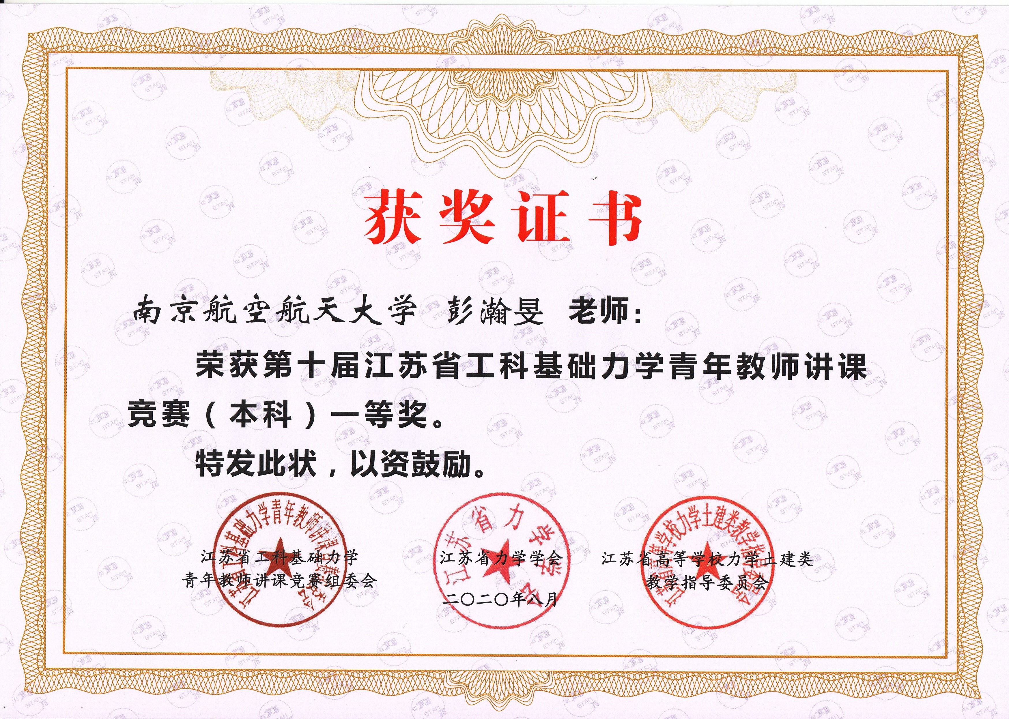 彭瀚旻获第十届江苏省工科基础力学青年教师讲课竞赛一等奖