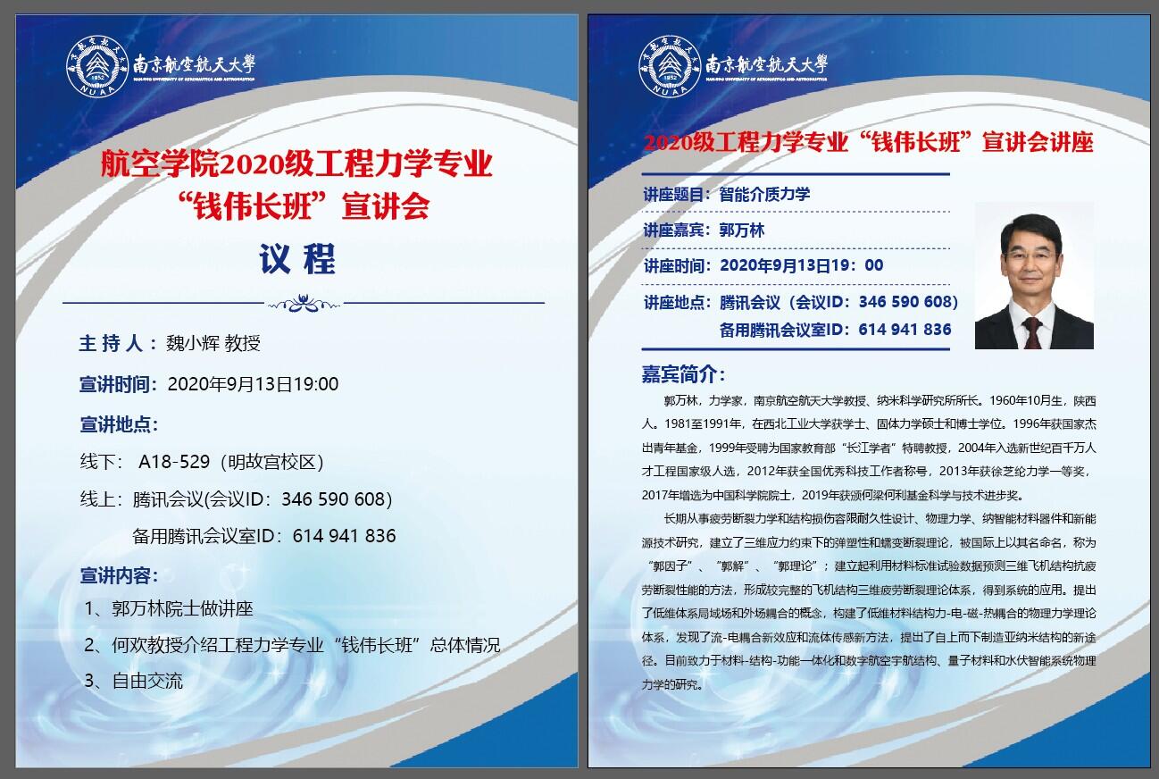 本次宣讲会顺利进行,不仅开拓了同学们的视野,又使同学们对我院 “钱伟长班”情况及政策有了更充分的了解,对工程力学专业有了更深刻的认识。老师们也殷切期望同学们在南航的四年能够不忘初心,以梦为马,将理想照进现实。