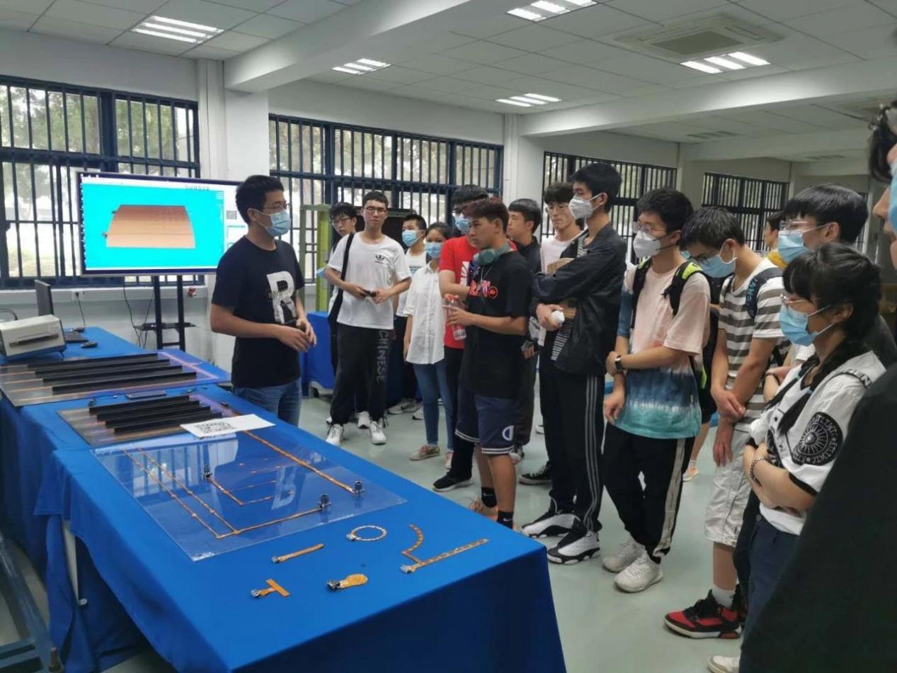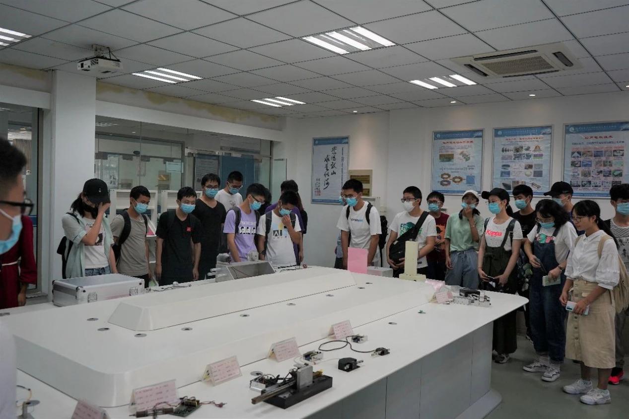 在精密驱动实验室,讲解员向同学们展示了实验室中各种各样的电机,介绍了超声电机与电磁电机的不同,并将拥有不同性能的十余种电机一一演示并结合高中物理知识向同学们简单讲解了其中原理。随后,讲解员借助实验室墙壁上的展板进一步介绍了精密驱动实验室在赵淳生院士带领下的发展历程以及研究成果。