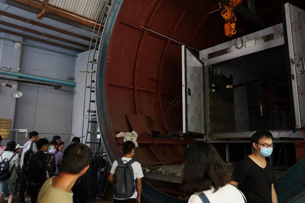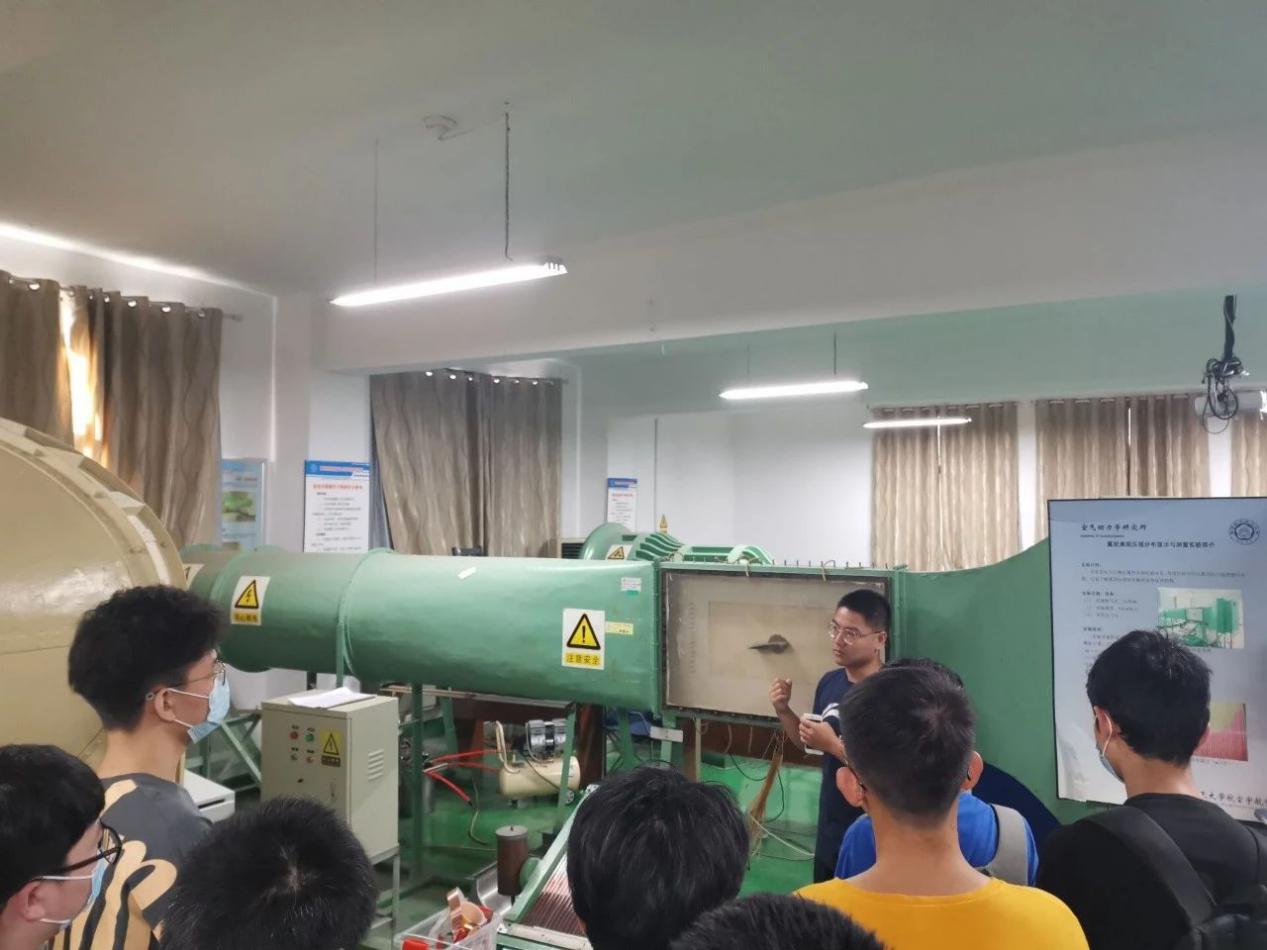 讲解员主要介绍了低速风洞,在讲解完原理后,他让每一位同学都感受了一下正在运行中的风洞吹出的到底是怎样的“风”。在一楼,同学们参观了回流式开口风洞,随后讲解员带领大家前往二楼参观直流式开口风洞,指导同学们观察风洞内部的结构细节,介绍了风洞实验的目的以及四个要素,最后向大家展示了实验模型。