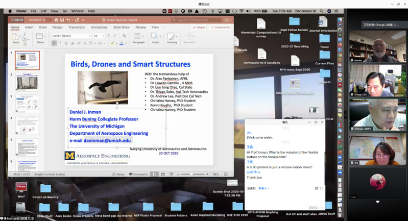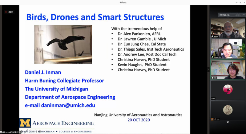 应我校英国上市公司365机械结构力学及控制国家重点实验室裘进浩教授的邀请,密歇根大学航空工程学院Daniel J. Inman教授于2020年10月20日做了题为“Birds, Drones and Smart Structures”的学术报告。报告介绍了变体飞行器的研究来源,重要意义和关键问题。探讨了智能材料,如压电复合材料MFC在变体机翼中的应用技术,并分享了课题组在该领域的最新进展。报告从介绍滑翔时鸟的翅膀和尾巴所表现出的有趣现象展开,生动地引入对变体飞行器结构的研究,在介绍变体结构技术的同时,以课题组具体的实验研究和视频资料展示了变体机翼的动作过程。此外,Inman教授还和与会人员积极的讨论相关技术问题。报告内容丰富、精彩生动,对我校相关科研工作具有借鉴作用。