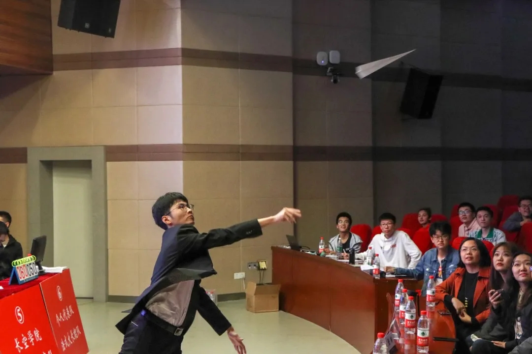“心灵手巧”环节,选手们需现场制作完成并放飞纸飞机,每队有两次机会。3号、5号和6号代表队的飞机直接飞到了会场的最后一排,引得全场阵阵欢呼。谈及他们的设计理念时,5号队运用了减少展弦比的原理,而3号能源与动力学院代表队则更注重于放飞的动力大小。“心有灵犀”环节,团队成员相互配合猜出航空航天专有名词,6号个人代表队表现抢眼,猜出全部五张图片。“背水一战”最后一个环节,共五道题,分值从10分到50分依次递增,答对得相应分数,答错扣除相应分数,高风险,高回报。比分落后的队伍放手一搏,比分领先的队伍也没有束手束脚,最后的胜负就在毫厘之间。