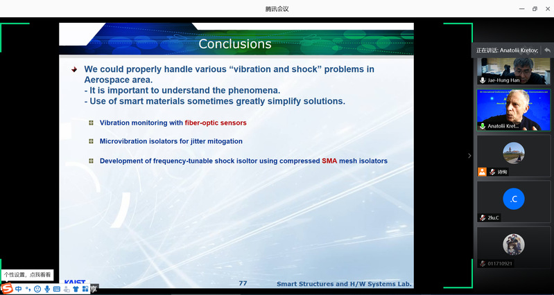 报告简要介绍了智能材料系统目前在高性能结构系统设计中的应用。在智能材料和结构的各种功能中,报告重点阐述了与振动监视和控制相关的智能材料系统。报告开始,JAE-HUNG HAN教授介绍了卫星中存在的振动源和振动特性,并提出了对卫星微振动的解决办法,包括其科研团队开发的一类微振动控制装置。