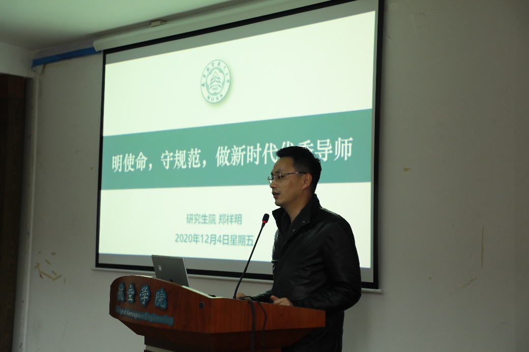 研究生院郑祥明副院长以“明使命,守规范,做新时代优秀导师”为主题,从研究生教育的新形势、新任务出发,通过对相关文件进行解读,详细阐述了研究生导师职责,介绍了当好研究生导师要做的基本工作。同时向大家传达了当前和今后一个时期研究生培养的目标和任务。