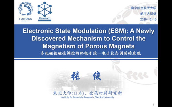 应我校机械结构力学及控制国家重点实验室朱孔军教授的邀请,日本东北大学金属材料研究所张俊博士于2020年12月16日做了题为“Electronic State Modulation (ESM): A Newly Discovered Mechanism to Control the Magnetism of Porous Magnets”的学术报告。