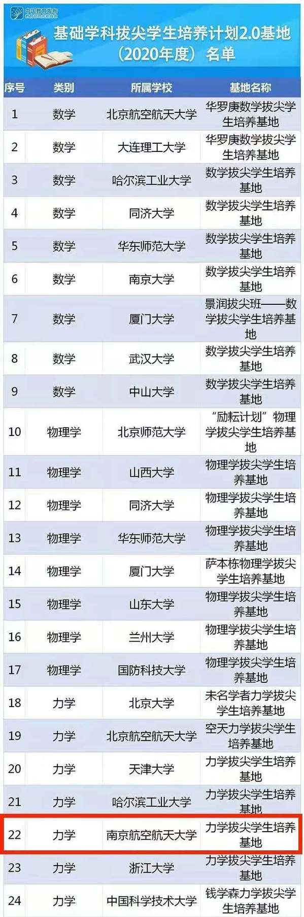 近日,教育部正式公布了基础学科拔尖学生培养计划2.0基地(2020年度)名单,我院力学拔尖学生培养基地成功入选,也是我校唯一入选的基地。