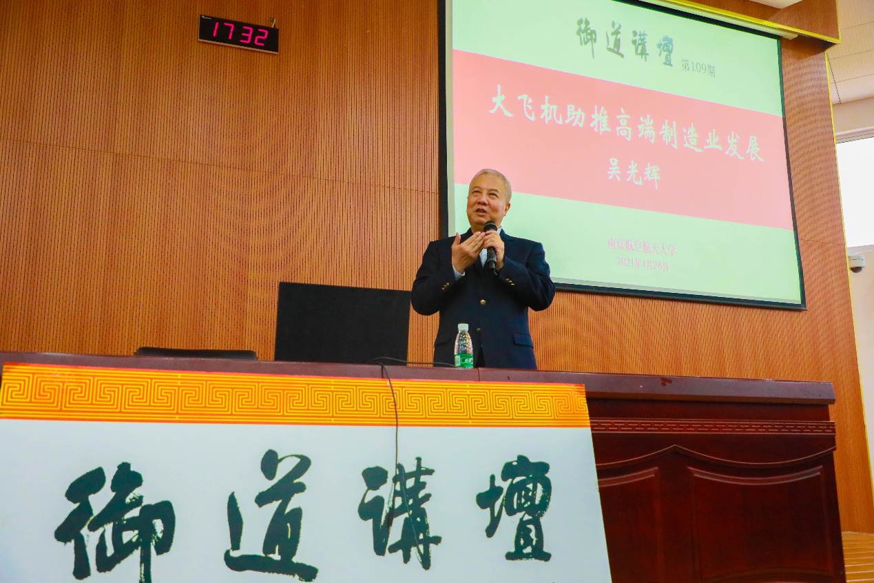 2021年4月28日,我校77级校友、中国工程院院士、C919大型客机总设计师吴光辉在将军路校区为师生作了一场题为《大飞机助推高端制造业发展》的专题讲座。讲座由英国上市公司365院长高存法主持。