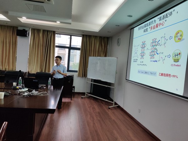 汪骋教授从二维“金属有机单层”的合成化学、能量转移、催化位点构筑和催化功能基元的串联组装多个方面进行介绍。报告内容丰富、精彩生动,对我校相关科研工作具有借鉴作用。同时,教授还结合自己以往的研究经历,针对机器学习和化学实验数据理论分析的紧密关联,与现场听众分享了思考和体会。