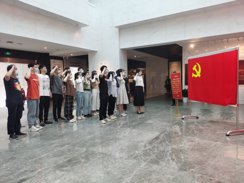 两支部全体党员瞻仰周恩来总理铜像并敬献花篮,随后在国共南京谈判史料陈列厅的汉白玉浮雕前,在学院党委书记冯绍红的带领下,面对着党旗,两支部的三名新党员进行入党宣誓,全体党员重温入党誓词。