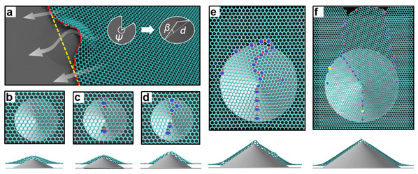 图1. (a) 石墨烯在具有圆锥形突起的基底上的生长示意图以及(b-f)几种典型的缺陷形貌:完美晶格、点缺陷、单晶界、晶界疤、长程晶界(由左至右)。