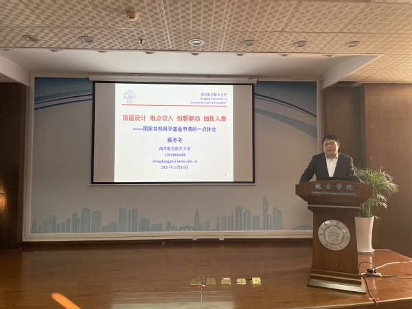 顾冬冬做了题为《顶层设计、难点切入、细致入微—国家自然基金申请的一点思考》的报告,基于学校和学院基金申报的现状,分析了学院近年来基金申报工作的优势和不足。而后,从“选题的背景”、“如何凝练科学问题”、“如何撰写基金申请书”等多个方面和申请人、评审专家、基金委工作人员等多个视角对基金申请书的撰写进行了讲解,并结合个人申报优青的经验,细致介绍了优青申报的要点。
