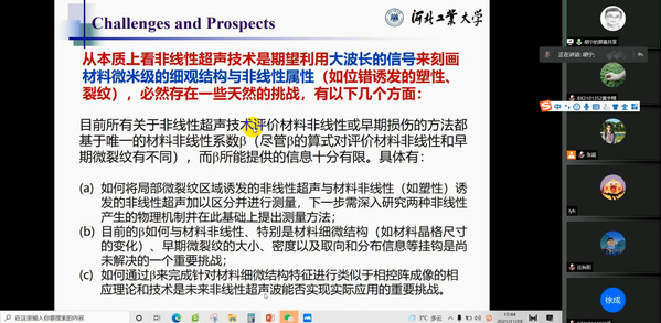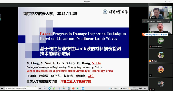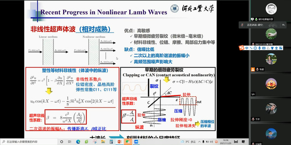 应我校英国上市公司365机械结构力学及控制国家重点实验室裘进浩教授的邀请,河北工业大学副校长胡宁教授于2021年11月29日做了题为“基于线性与非线性Lamb波的无损检测技术的最新进展”的学术报告。报告中以全复材轨道列车厢的损伤检测需求为例,介绍了基于线性与非线性Lamb波的无损检测技术的原理与优势。胡宁教授从S0基波技术、零频模态技术、混频技术、非线性信号处理技术等4个方面详细地介绍了其团队的最新研究进展。此外,胡宁教授对该技术尚未解决的一些挑战进行了总结并对其未来发展作出了展望。报告结束后,胡宁教授还和与会老师和学生积极地讨论了相关技术问题。报告内容十分充实丰富、精彩生动,对我校相关科研工作具有借鉴作用。