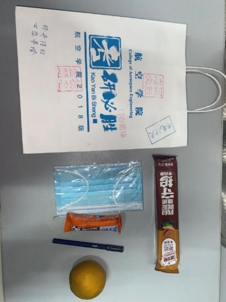 “考研加油包”内包括了零食、水果和文具,寓意着“脐”开得胜,心想事“橙”、“薯”你最棒、金榜题名。同时也提醒同学们冬天注意补充维生素和“甜份”,准备好考试用品并且做好防疫措施,以最佳状态迎接即将到来的考试。