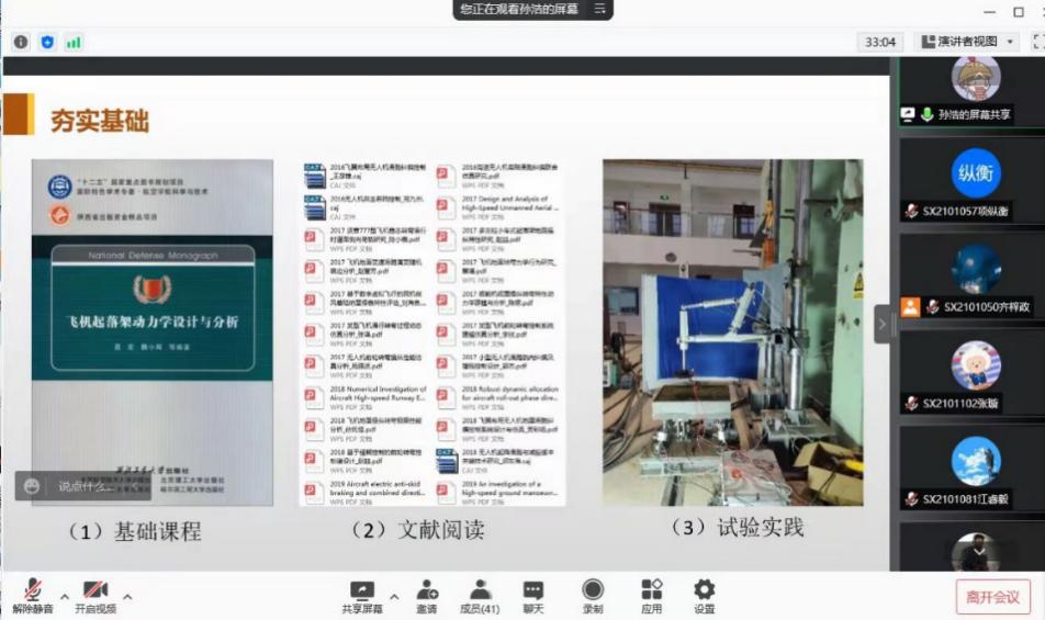 飞行器设计专业2019级硕士研究生孙浩根据自己在研究生期间的心得体会,做了课程学习、文献阅读、实验实践三方面的分享,他强调,专心踏实是学习工作的成功之道,认真严谨是做学术做科研的基本要求。踏实走好每一步,才能迎来自己的收获。同时也要注意劳逸结合,学会自我规划与自我激励。