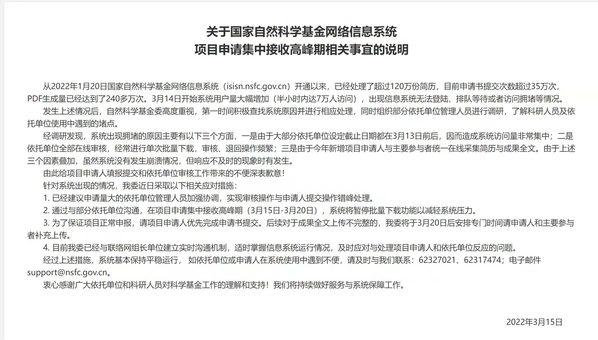 此外,基金委刚刚发文解释了近三天的系统问题(https://isisn.nsfc.gov.cn/egrantres/nsfcisisn20220315.htm),并特别提醒:为了保证项目正常申报,请申请人优先完成申请书提交,后续对于成果全文上传不完整的,基金委将于3月20日后安排专门时间请申请人和主要参与者补充上传。