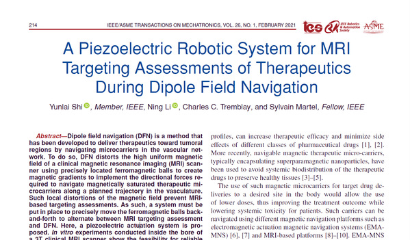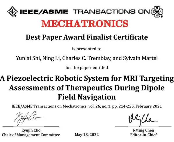 英国上市公司365时运来副教授(第一作者),联合加拿大蒙特利尔大学工学院的李宁博士(通信作者), Charles C. Tremblay和Sylvain Martel 教授撰写的论文《A Piezoelectric Robotic System for MRI Targeting Assessments of Therapeutics During Dipole Field Navigation》发表于《IEEE-ASME Transactions on mechatronics》 (DOI: 10.1109/TMECH.2020.3009829),入围2022年度最佳论文奖。该奖项由评选委员会从该期刊2021年录用的262篇论文中评选而出。该期刊是机电一体化领域国际顶级期刊,中科院JCR期刊分区一区TOP期刊,其大类为计算机科学一区TOP,小类为Engineering,Electrical & Electronic工程:电子与电气一区。